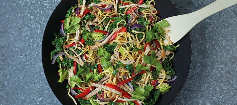 2. Add the noodles and 2 tablespoons water. Stir-fry for 2-3 minutes until heated through. Serve garnished with the coriander.